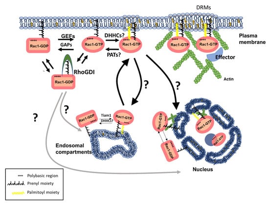 Small GTPase prenylation also has an impact on their guanosine nucleotide binding state, and non-prenylated Rho GTPase species exhibit increased GTP binding through mechanisms as yet poorly understood [,]. A potential explanation is that non-prenylated GTPases bind RhoGDI less efficiently (see above), favoring their interaction with GEFs as compared with prenylated pools. Supporting this interpretation, knockdown of RhoGDI also increases GTP loading of Rho GTPases [,]. Alternatively, non-prenylated RhoGTPases might interact less with a GTPase-activating protein. A key challenge in understanding small GTPase biology resides in clarifying this contradictory regulation between prenylation and guanine nucleotide binding state, onto which characterizing the principles of intracellular compartmentalization can provide insight. A non-prenylated Rac mutant (RacSAAX mutant) displays a dual cytosolic and nucleoplasmic distribution [,]. Similarly, prenylation of other proteins, such as a plant ortholog of calmodulin, controls the equilibrium between PM vs. nuclear localization []. Of note, nuclear lamins require, apart from nuclear localization signals, a CAAX motif for their anchoring to the inner nuclear membrane, stressing the relevance of prenylation for the appropriate subcellular distribution of the proteome [].