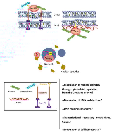 Further, the nucleus is subjected to direct mechanical cues and constitutes an emerging mechanotransducer structure in the cell. Different mechanisms determine nuclear mechanics: (i) regulation of lamins, and lamin B receptor expression levels, modulate nuclear envelope integrity and deformability []; (ii) the Linker of Nucleoskeleton and Cytoskeleton (LINC) complex is a specialized structure that embodies the early observed physical linkage of nuclear structural components with the cytoskeleton [,,]; (iii) RhoGTPase signaling-dependent actin dynamics might provide a third broad mechanoadaptive component [,]. Rac1-regulated actin dynamics contribute to nuclear membrane organization, which in turn can have an impact on LMNA/C-emerin complex distribution, supporting direct crosstalk between nuclear actin network changes and lamin cortex integrity and remodeling; further, Rho GTPase control of the cytoskeleton is an additional input, through the LINC complex, onto nuclear mechanoadaptation. Current investigations demonstrate that Rac1 induces nuclear alterations through microtubules and LINC complex to promote an invasive phenotype in melanoma cells []. Rho GTPases are also involved in the specific control of the perinuclear actin cap, a specialized cytoskeletal structure of fibers contacting the nucleus that regulates both nuclear morphology and re-orientation during front-rear polarization. While the detailed mechanisms regulating actin cap dynamics are currently under investigation, recent studies have shown that STEF/Tiam 2, a Rac1-selective GEF that localizes at the nuclear envelope, has the ability to regulate perinuclear Rac1 activity [] (Figure 3).