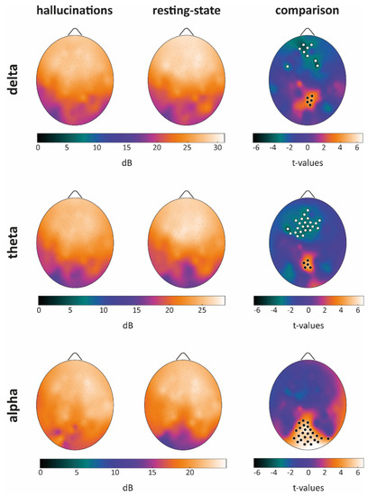 Average scalp maps for each band and condition are presented in the first two columns. Band-wise comparisons are presented in the third column. Black dots indicate electrodes showing a significantly higher PSD during the VH condition as compared to RS, white dots the opposite relationship. Critical t-values (in absolute value) for significance at p = 0.05 are, respectively, |t| = 3.22 for delta, |t| = 3.13 for theta and |t| = 3.12 for alpha band (single-threshold tests for the maximum t-statistics).