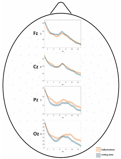 As compared to RS, the VH condition was characterized by PSD decreases in the midline frontal areas for delta and theta bands. Both decreases were paralleled by PSD increases in the midline posterior areas corresponding at a cortical level to posteromedial cortical regions, thus including the precuneus. This latter structure has been associated with self and visual awareness [43], and its activity seems to correlate with self-reflection processes [44,45], including mental imagery [46]. Based on these considerations, we speculate that the activity of the posteromedial cortex could play a crucial role in the patient’s awareness of perceiving visual hallucinations instead of real scenarios. During the VH condition, coherently with what always happens when the patient is hallucinating outside (as reported during the anamnesis with the neurologist), the subject was aware of the unreality of his hallucinations, suggesting a successful and preserved reality monitoring. Interestingly, the precuneus has been identified as one of the regions of interest supporting successful reality monitoring in humans [47]. In general, CBS patients do recognize the unreality of their visual hallucination [1]: this ability may be related to the fact that they were sighted people becoming blind very late in their life. The unreality of the hallucinations is experienced as pleasant by our CBS patient, but this is not the case of all CBS patients who may, in some cases, suffer from anxiety [48].