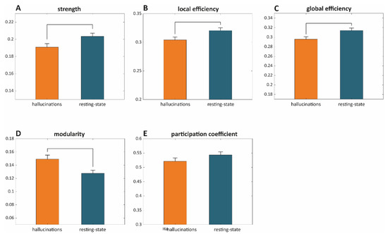 For each graph metric in the theta band, descriptive statistics for the two conditions are presented (mean + standard error). In each subplot, the orange bar represents the considered metric estimated during the VH condition, while the blue bar represents the metric related to the RS. Significant between-condition differences (p < 0.05 after FDR correction) are highlighted by a black line connecting the two bars. Graph strength is presented in (A), local efficiency in (B), global efficiency in (C), modularity in (D) and participation coefficient in (E).