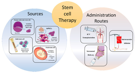 Stem cells, present in every living organism, are cells characterized by the unique ability to proliferate indefinitely by using a particular asymmetrical division, by self-renewal properties, and by the competence to drive their differentiation towards specific cell phenotypes in, virtually, all tissues [1]. In this perspective, the skill of stem cells to repair damaged tissues and restore physiological functions to diseased organs opens new scenarios for the treatment of pathological conditions for which current therapeutic options and respective clinical outcomes are quite poor or null [2]. In such a scenario, neurodegenerative disorders represent a promising target for stem cell-based therapy since the progressive loss of both neurons and glial cells unavoidably leads to irreversible damage in the central and peripheral nervous system. Multiple pathological mechanisms of damage, such as those occurring in Parkinson’s disease (PD), Alzheimer’s disease (AD), and Amyotrophic Lateral Sclerosis (ALS), have raised research interest for stem cell replacement therapy [3]. Some previous studies have reported that transplantation of stem cells into animal models of neurodegenerative diseases improved endogenous neuronal function by mediating remyelination, releasing trophic factors, and modulating inflammation [4,5,6,7,8]. To date, two different stem cell-based therapeutical approaches have been reported: the first one is based upon stimulation/boosting the endogenous neural progenitor cells to improve the release of trophic factors and growth molecules for tissue repair [9]; the second one points out grafting exogenous stem cells [10]. Here, we provide an update of the current knowledge about both source and administration routes of stem cells and review scientific literature regarding the use of stem cell replacement therapy for the treatment of the three main neurodegenerative diseases (i.e., AD, PD, and ALS).