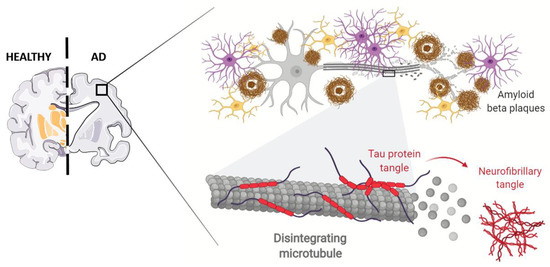 Schematic representation of Alzheimer Disease AD pathophysiology. This progressive neurodegenerative disorder is characterized by atrophy of brain regions, leading to a significant reduction in brain volume correlated to cognitive decline and memory deficits. The neuropathological hallmarks of AD are represented by extracellular senile plaques (the brown ring in the inlet), composed of amyloid-β (Aβ) peptide, followed by intracellular deposition of neurofibrillary tangles (NFTs) generated by hyperphosphorylated protein tau. In addition, glial (pink cells) and microglial (yellow cells) activation and subsequent inflammatory responses are thought to contribute to the neurodegenerative symptoms of AD. Adapted from “Alzheimer’s Brain (Disintegrating Microtubule)” by BioRender.com (2021). Retrieved from (https://app.biorender.com/biorender-templates/, accessed on 13 July 2021).
