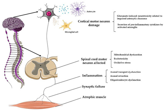 Schematic representation of Amyotrophic Lateral Sclerosis (ALS) pathophysiology. ALS is a progressive neurodegenerative disease, with a multifactorial etiology, characterized by motor neurons’ death in the motor cortex and in the spinal cord’s ventral horn. Furthermore, astrocytes are not able to support neuronal functions and impaired glutamate clearance leads to neuronal excitotoxicity, this, combined with the secretion of pro-inflammatory cytokines by predominant activated microglia, contributes to the development of motor neuron dysfunction. The ventral roots become thin with loss of large myelinated fibers in motor nerves leading to denervation atrophy in affected muscles. Illustrations used elements from Servier Medical Art (https://smart.servier.com/, 12 July 2021).