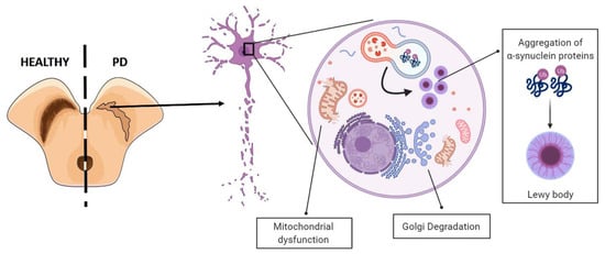 Schematic representation of Parkinson Disease (PD) pathophysiology. The main pathological hallmark of PD the progressive degeneration of striatal-projecting midbrain dopaminergic neurons of the ventral forebrain due to aggregation and accumulation of the protein α-synuclein (Lewy bodies), which cause mitochondrial disfunctions, endoplasmatic reticulum (ER) stress, and Golgi degradation. Illustrations used elements from Servier Medical Art (https://smart.servier.com/, 15 July 2021).