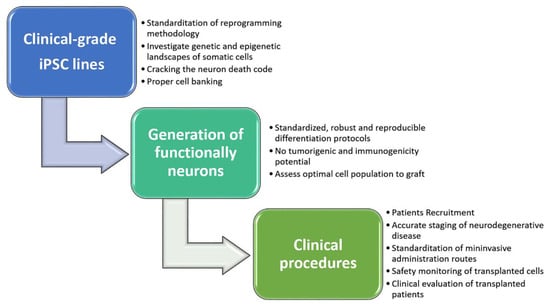 Schematic roadmap to guide successful clinical trials and maximize therapeutical potential of iPSC-based personalized cell replacement for patients with neurodegenerative diseases. Illustrations used elements from Servier Medical Art (https://smart.servier.com, 14 July 2021).
