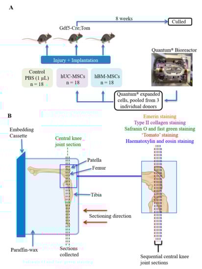 A schematic to show the joint surface injury (JSI) experimental design and histological staining process (partially created using Biorender.com (accessed on 15 May 2021)). (A) At the time of injury, Quantum-expanded human BM-MSCs or human UC-MSCs (2 × 105 cells in 1 µL of PBS) were implanted, unless the mice were in the vehicle control group, in which case they received PBS alone. The mice were culled after 8 weeks. (B) The orientation of paraffin-embedded murine knee joints in the JSI model. The knee joint sections were cut as indicated, with sequential central knee joint sections being stained with safranin O and fast green, haematoxylin and eosin, or antibodies against type II collagen, emerin or tdTomato.