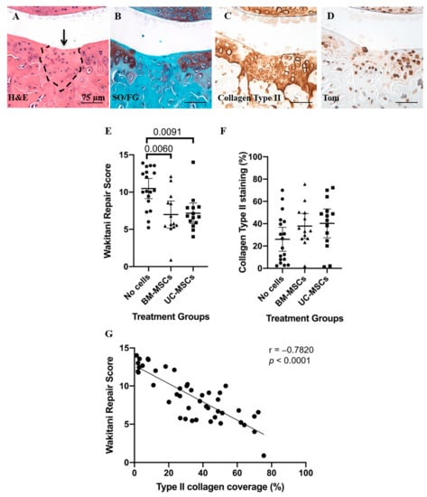 Adjacent sections from one mouse used for histology and immunohistochemistry showing (A) the repair tissue (dashed line, H&E staining) which has formed 8 weeks post-injury in mice that received human UC-MSCs (arrow), with (B) less staining for safranin O but (C) significant collagen type II immunostaining, compared to the adjacent native cartilage. (D) Cells populating the repaired region were endogenous cells that descended from the cells of the embryonic joint interzone, as shown by positive staining for tdTomato. Scale bars = 75 µm. (E) Assessment of cartilage repair tissue. The Wakitani cartilage repair score was significantly lower for both human BM-MSCs and human UC-MSCs, indicating better repair compared with the no cell control. (F) Immunohistochemistry demonstrated that there was no significant difference between any of the treatment groups with regard to the amount of collagen type II staining in the repair tissue. Data are presented as the mean ±95% CI. (G) Area of repair tissue immunostaining positive for type II collagen plotted against the Wakitani scores for all knee joints from all treatment and control groups.