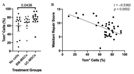 Tomato positive (Tom+) cells in repair tissue. (A) Cell-treated groups had more tomato-positive cells compared to the no cell control group, but this was only significant for human UC-MSCs. This indicated that a greater number of cells populating the repaired region originated from the murine joint interzone, as shown by Tom+ staining. Data are presented as the mean ±95% CI. (B) Percentage of Tom+ cells within the repair tissue plotted against the Wakitani scores for all knee joints from all treatment and control groups.