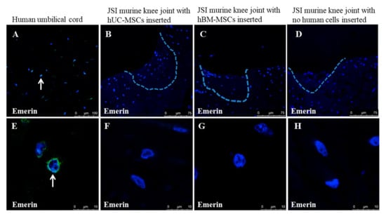 Immunostaining with the human anti-emerin antibody demonstrated (A,E) positive cells (arrows) in a section of human umbilical cord, but not in any mouse knee joints (B–D,F–H), including those which had human UC-MSCs (B,F) or human BM-MSCs (C,G) applied.