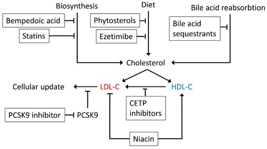 Where statin treatments are ineffective or induce severe side-effects, alternative treatments include intestinal absorption inhibitors such as ezetimibe that reduce absorption from diet, but do not regulate cholesterol biosynthesis []. Phytosterols similarly block cholesterol absorption [] and bile acid sequestrants and niacin can also be used in treatment [,]. LDL receptors (LDLr) are responsible for cellular uptake of LDL-C from the blood and Proprotein Convertase Subtilisin/Kexin type 9 (PCSK9) targets the LDL receptors (LDLr) for lysosomal degradation []. In recent years, proprotein convertase subtilisin kexin 9 (PCSK9) inhibitors have been approved as treatments by the U.S. Food and Drug Administration (FDA) and European Medicines Agency (EMA) []. These treatments inhibit the PCSK9 mediated degradation of LDLr, increasing the abundance of LDLr and the cellar uptake of LDL-C [,]. Moreover, currently being investigated are cholesterylester transfer protein (CETP) inhibitors that reduce the transfer of high density lipoprotein cholesterol (HDL-C), which itself is inversely correlated with risk, to atherogenic LDL-C [,], and Bempedoic acid that inhibits cholesterol biosynthesis upstream of HMGCR []. A schematic of how these treatments affect cholesterol metabolism is shown in Figure 1.