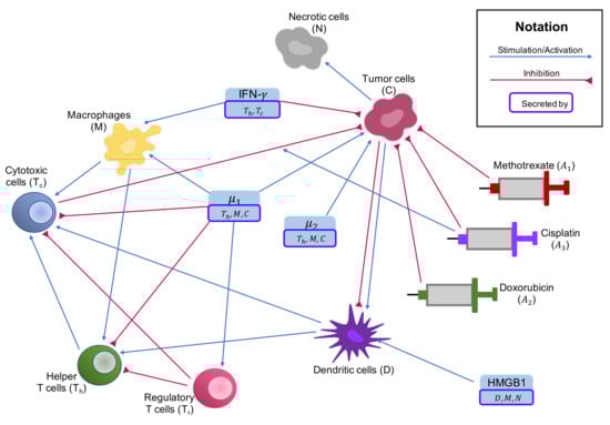 The interactions among key components of the osteosarcoma tumor microenvironment modeled in [58] are summarized below. IFN-, which is secreted by helper T cells and cytotoxic cells [28,29,30], can promote macrophages and inhibit cancer cell proliferation [25,27,28,59,60,61,62]. Cytokine group is released by helper T cells, macrophages, and cancer cells [30,60,61,62,63,64,65]. can activate regulatory T cells and macrophages, promote tumor proliferation [29,59,60,62,64,66,67,68,69], and inhibit cytotoxic cells and helper T cells [62,66,70,71]. Cytokine group is also produced by helper T cells, macrophages, and cancer cells [30,62,63,64,72,73], and can promote tumor proliferation [29,61,67,68,72,73,74]. HMGB1, which is passively secreted by necrotic cells [22,26,75,76] and actively secreted by dendritic cells and macrophages [21,22,23,24,75,77], can activate dendritic cells [21,22,23,24].