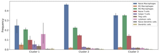A recent study showed that among the available digital cytometry methods with which to deconvolve the gene expression data of a tissue into relative abundances of cells in the tissue, CIBERSORTx B-mode performs best [92]. In our previous study [58], we used the gene expression data of 88 osteosarcoma tumors from TARGET data set and applied CIBERSORTx B-mode to estimate the fractions of immune cells in each of these tumors. Then, k-means clustering was performed on the estimated cell fractions, and three clusters of osteosarcoma tumors with distinctive immune patterns were found. In this work, we study the impacts of chemotherapy drugs on the same three clusters. The average immune fractions in each cluster are presented in Figure 2.