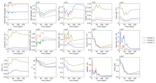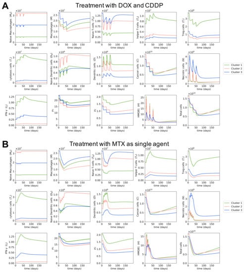 Dynamics with MAP treatment. Behaviors of cells and cytokines in osteosarcoma tumors during the MAP treatment and a few months after treatment. Initial conditions are large tumors in each cluster, i.e., the without-treatment steady state values of each cluster. Drug doses are the typical doses of the MAP regimen. The different color lines indicate the dynamics of different clusters.