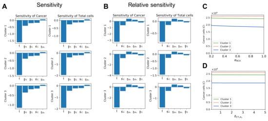 In all clusters, the initial fraction of cells in the vulnerable phase of the cell cycle f has the largest impact on cancer cell population among treatment-related parameters according to both the sensitivity and relative sensitivity analyses. The rate of chemotherapy-induced cancer cell death, , and the drug efficacy coefficients of doxorubicin and cisplatin, and , are also sensitive to cancer and total cell population during treatment. Meanwhile, the drug efficacy coefficient of methotrexate, , does not seem as sensitive, but the decay rate of methotrexate is.