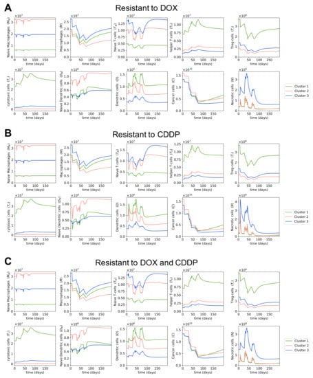 The effectiveness of chemotherapy is highly dependent on the existence of resistant cancer cells. We are interested in studying the changes in quantity of cells and cytokines when osteosarcoma cells are resistant to one or multiple drugs within the MAP regimen. As mentioned in Section 2, we obtained drug efficacy coefficients from [84]; these values were estimated to fit the survival data of cancer cells under different chemotherapy drugs. The same study [84] also included the estimated drug efficacy coefficients of doxorubicin and cisplatin in doxorubicin-resistant and cisplatin-resistant cancer cells, respectively. Using these parameter values, we plotted the dynamics in the osteosarcoma microenvironment during MAP treatment when cancer cells are resistant to either doxorubicin or cisplatin, or to both drugs. Since methotrexate-resistant cells were not used in [84], and hence no parameter values were available for them, we did not model the dynamics with methotrexate-resistant cells.