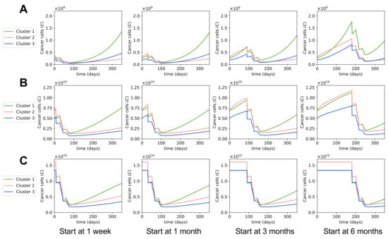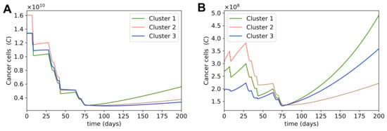 Cluster 2 had the highest cancer cell population at the start of treatment, so naturally cluster 2 also had the highest cancer cell population left after neoadjuvant therapy. Interestingly, cluster 1 had approximately the same number of cancer cells as cluster 3 at the start of treatment, but ended up with a higher cancer cell population than cluster 3 after treatment. This is because in each chemotherapy cycle, there are a few weeks where no chemotherapy drugs are administered in order to allow the patient to recover from the drugs’ toxicity, and thus during these few weeks, cancer cells can start growing again. Cluster 1’s cancer cell population, which was reported in [58] to have the highest growth rate in the three clusters, grew more during the weeks with no drugs given, resulting in a higher number of cancer cells after treatment compared to cluster 3. This observation suggests that we should take the patient’s cancer growth rate into account when choosing their chemotherapy dosage.