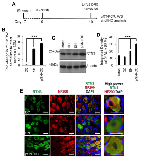 RTN3 is upregulated in dorsal root ganglion neurons (DRGN) after preconditioning lesions. (A) The diagram shows the timeline of treatments and tissue harvesting. (B) qRT-PCR to confirm upregulated RTN3 mRNA in SN and pSN + DC injury models (n = 16 DRG/group (8 rats/group)). (C) Western blot to show levels of RTN3 in control, DC, SN and pSN + DC injury models (n = 16 DRG/group (8 rats/group)). (D) Densitometry to confirm upregulation of RTN3 in SN and pSN + DC injury models (n = 16 DRG/group (8 rats/group)). (E) Immunohistochemistry to show immunolocalisation of RTN3 (green) in DRGN (red). Data are means ± SEM. Scale bars in (E) = 50 µm. *** p = 0.0001, one-way ANOVA with Dunnett’s post hoc test.