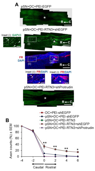 To determine if RTN3 overexpression promotes DC axon regeneration in vivo and whether knockdown of Protrudin with shRNA (shProtrudin) ablates RTN3 overexpression-mediated axon regeneration over 6 weeks (Figure S4 in Supplementary Material), we stained appropriately treated spinal cords with GAP43 antibodies to mark regenerating axons, since cholera toxin B labelling does not work in our hands in the rat [31]. Many GAP43+ axons were seen crossing the lesion site (*) and reaching at least 6 mm (>20%) into the distal segment of the spinal cords of pSN + DC + PEI-RTN3-treated rats compared to little or no GAP43+ staining in pSN + DC + PEI-EGFP-treated control spinal cords (Figure 6A,B). FluoroRuby (FR) anterograde tracer was used as a second method to confirm that GAP43+ regenerating axons were also co-labelled with FR in the same sections. However, treatment with shProtrudin at the same time as RTN3 overexpression (pSN + DC + PEI-RTN3 + shProtrudin) ablated GAP43+ regenerating axons in spinal cords, normally observed after RTN3 overexpression (pSN + DC + PEI-RTN3 + shEGFP) (Figure 6A,B).
