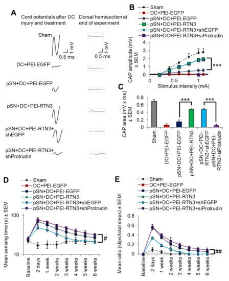 RTN3 overexpression promotes electrophysiological, sensory and locomotor functional recovery after DC injury. (A) Representative Spike 2 processed CAP traces in sham, DC + PEI-EGFP, pSN + DC + PEI-EGFP, pSN + DC + PEI-RTN3, pSN + DC + PEI-RTN3 + shEGFP and pSN + DC + PEI-RTN3 + shProtrudin-treated animals. (B) Negative CAP amplitudes at different stimulation intensities in sham, DC + PEI-EGFP, pSN + DC + PEI-EGFP, pSN + DC + PEI-RTN3, pSN + DC + PEI-RTN3 + shEGFP and pSN + DC + PEI-RTN3 + shProtrudin-treated animals. (C) CAP areas at all stimulation intensities in sham, DC + PEI-EGFP, pSN + DC + PEI-EGFP, pSN + DC + PEI-RTN3, pSN + DC + PEI-RTN3 + shEGFP and pSN + DC + PEI-RTN3 + shProtrudin-treated animals. (D) Mean tape sensing and removal times in sham, DC + PEI-EGFP, pSN + DC + PEI-EGFP, pSN + DC + PEI-RTN3, pSN + DC + PEI-RTN3 + shEGFP and pSN + DC + PEI-RTN3 + shProtrudin-treated animals. (E) Mean error ratio to show the number of slips over the total number of steps in sham, DC + PEI-EGFP, pSN + DC + PEI-EGFP, pSN + DC + PEI-RTN3, pSN + DC + PEI-RTN3 + shEGFP and pSN + DC + PEI-RTN3 + shProtrudin-treated animals. Data are means ± SEM. n = 18 rats/group. *** p = 0.0001, one-way ANOVA with Dunnett’s post hoc test. # p = 0.0012, linear mixed models (LMM); ## p = 0.00012, generalised linear mixed models (GLMM).