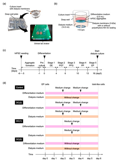 In our previous report, we designed a simple dialysis suspension culture system and demonstrated its effective usage in the differentiation of hiPSCs to DE cells [17]. The dialysis culture was possible to refine the culture medium by removing lactate while retaining macromolecules such as growth factors and autocrine factors in the culture medium, which enabled the reduction of the medium replacement frequency and minimized the usage of growth factors. However, this system has not been applied to the other differentiation stages of pancreatic islet-like cells. Among those stages, the differentiation of EP cells into pancreatic islet-like cells is especially important, because this stage requires the second-highest cost in the whole stages next to DE differentiation, and the maturity of pancreatic β cells in this stage affects the capability of the insulin-secretion of pancreatic β cells [4,11,12].