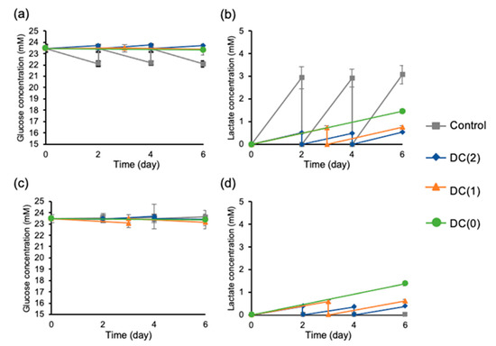 Glucose and lactate concentration of differentiation medium and dialysis medium were measured at every medium change during the differentiation. (a) Glucose concentration of differentiation medium, (b) lactate concentration of differentiation medium, (c) glucose concentration of dialysis medium, and (d) lactate concentration of dialysis medium. Control: without dialysis, medium change 2 times, DC(2): with dialysis, medium change 2 times, DC(1): with dialysis, medium change 1 time, DC(0): with dialysis, without medium change. Data represent mean ± SD of n = 5–6 from two independent experiments.