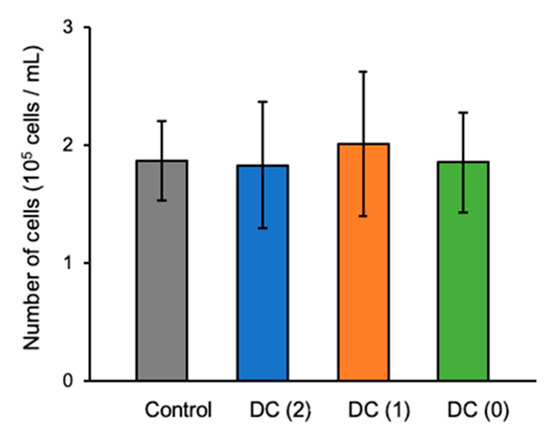 Prepared hiPSCs-derived EP cell aggregates were moved to the dialysis suspension culture system, and differentiation of islet-like cells was performed with 2.4 × 105 cells/mL cell density in the culture insert (Figure 1b). After stage 6, the differentiated cell aggregates were collected and dissociated for cell count. There were no significant differences shown in the number of produced cells between Control, DC(2), DC(1), and DC(0) (Figure 3).
