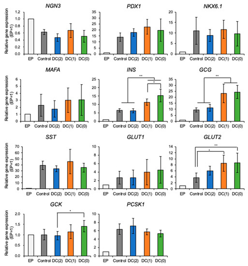 To evaluate the gene expression of differentiated islet-like cells cultured in each culture condition, the mRNA levels were measured by RT-qPCR (Figure 4). The mRNA expression of NGN3 was decreased in all conditions on day 6 compared to EP cells. NGN3 starts to express from the early endocrine progenitor and decreases with the maturation of islet-like cells [18]. In contrast, the expression levels of pancreatic genes such as PDX1, NKX6.1, MAFA, INS, GCG, SST, GLUT2, and PCSK1 were upregulated on day 6 of stage 6 in all conditions compared to EP cells. These results suggest that the differentiation of islet-like cells was successful. DC(1) and DC(0), with less medium change frequency, expressed significantly higher levels of pancreatic endocrine hormones INS (insulin) and GCG (glucagon) than Control and DC(2), with conventional medium change frequency. Furthermore, expression levels of glucose sensing and metabolism-related genes such as GLUT (glucose transporter) 1, GLUT2, and GCK (glucokinase) in DC(0) tended to be higher than in the Control. GLUT2, particularly, was expressed significantly higher in DC(1) and DC(0) than in the Control, whereas there were no significant differences showed in PDX1, NKX6.1, MAFA, and PCSK1.