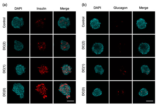 The characteristic of islet-like cells was examined by immunostaining in each culture condition. We observed insulin and glucagon positive cells of islet-like cells in all culture conditions, and we found the positive cell area of DC(1) and DC(0) was increased (Figure 5). From the measurement of insulin and glucagon positive cell area, the percentage of insulin-produced cell area of DC(1) (20.6 ± 5.8%) and DC(0) (24.1 ± 7.9%) were significantly increased compared to the Control (8.6 ± 4.4%) (Figure S1a). In addition, the glucagon-produced cell area of DC(0) (1.78 ± 1.02%) showed a significantly larger area than the Control (0.52 ± 0.36%) (Figure S1b). These results indicate that more cells in DC(0) produced insulin or glucagon, following the results of mRNA expression levels of INS and GCG.