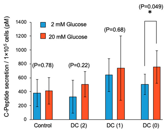To confirm the function of pancreatic β cells in the differentiated islet-like cells, we performed a low high glucose-stimulated C-peptide secretion assay to evaluate GSIS (Figure 6). In the first glucose stimulation, we could not observe a significant increase of C-peptide secretion by high glucose in all culture conditions (Figure S2). In our experience, sometimes differentiated islet-like cells showed unstable C-peptide secretion in the first glucose stimulation, thought to be due to their immatureness. In the second glucose stimulation of GSIS, we observed the fold increase of C-peptide secretion response to high glucose and only DC(0) showed a significant increase of C-peptide secretion (Figure 6). In addition, DC(1) and DC(0) showed the tendency of higher secretion of C-peptide in each low and high glucose concentration than DC(2) and Control. Then, we calculated the ratio of C-peptide secretion in high glucose to low glucose, and the results were Control: 1.26 ± 0.76, DC(2): 1.35 ± 0.64, DC(1): 1.18 ± 0.35, DC(0): 1.57 ± 0.57 (Figure S3).