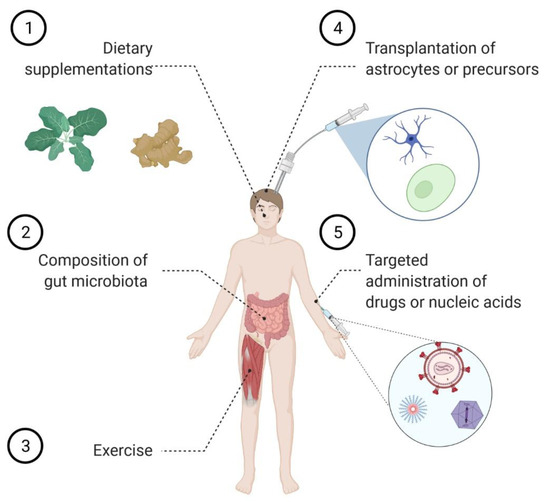 The many ways to reach the stars. Several possible strategies can be endorsed to boost the protective activities of the astrocytes towards neurons. These include changing the lifestyle by (1) including in the diet foods rich in antioxidants, such as broccoli and turmeric, (2) controlling the gut microbiota, and (3) regularly performing physical exercise. In the case of neurodegenerative conditions, i.e., when astrocytes themselves undergo degeneration, (4) transplantation of either astrocytes or their precursors can provide therapeutic benefits. Alternatively, (5) aberrant pathways can be precisely targeted by using advanced delivery systems, such as functionalized nanoparticles, homing peptides, or viruses, to convey drugs or nucleic acids into the astrocytes in order to correct the altered signaling cascades. (Created with BioRender.com).