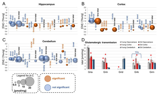 Changes in proteins involved in glutamatergic transmission upon aging. Plots show ratios of protein concentrations in old vs. young brain structures: hippocampus (A), cortex (B) and cerebellum (C). Total concentrations of various receptor families in young and old animals are shown in (D) (★ p < 0.05). The size of bubbles is proportional to the average protein concentration in the respective old brain structures. Statistically significant differences are shown as the red bubbles.