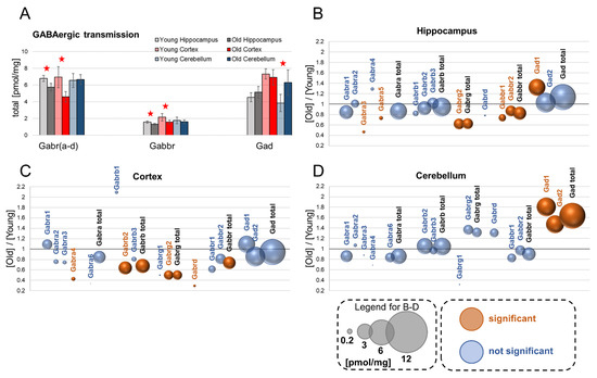 Changes in proteins involved in GABAergic transmission upon aging. Total concentrations of various receptor families in brains structures of young and old animals (A) (★ p < 0.05). Plots (B–D) show ratios of protein concentrations in old vs. young brain structures: hippocampus (B), cortex (C) and cerebellum (D). The size of bubbles is proportional to the average protein concentration in the respective old brain structures. Statistically significant differences are shown as the red bubbles.
