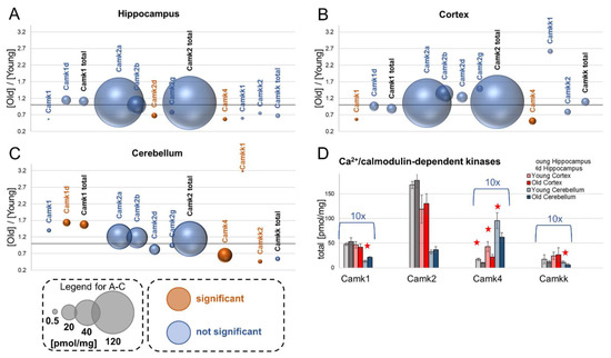 The effect of aging on calcium/calmodulin-dependent kinases. The ratios of protein titers in old vs. young brain structures in: hippocampus (A), cortex (B) and cerebellum (C). Total concentrations of the kinase families in young and old animals are shown in (D) (★ p < 0.05). The size of bubbles is proportional to the average protein concentration in the respective old brain structures. Statistically significant differences are shown as the red bubbles.