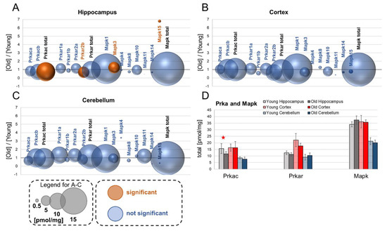 Aging-related changes in PKA (Prka) and Map kinases. The ratios of the kinase concentrations in old vs. young brain formations in: hippocampus (A), cortex (B) and cerebellum (C). Total concentrations of the kinase families in young and old animals are shown in (D) (★ p < 0.05). The size of bubbles is proportional to the average protein concentration in the respective old brain structures. Statistically significant differences are shown as the red bubbles.