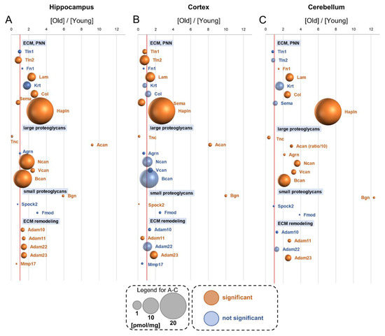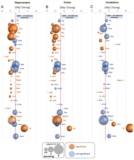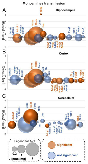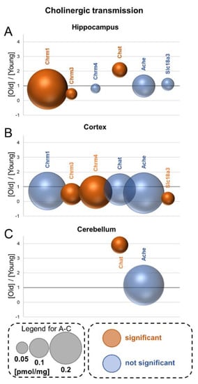 Aging-associated changes in cholinergic transmission. Plot shows the ratios of the titers of the receptors and proteins involved in acetylcholine metabolism in old vs. young brain formations in: hippocampus (A), cortex (B) and cerebellum (C). The size of bubbles is proportional to the average protein concentration in the respective old brain structures. Statistically significant differences are shown as the red bubbles.