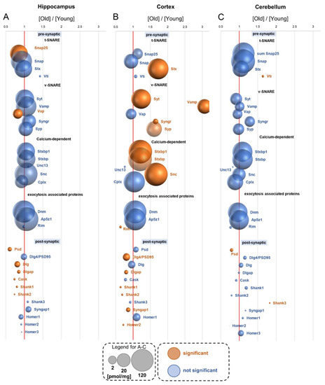 Recently, we measured concentrations of proteins involved in neuronal plasticity in the hippocampus, cerebral cortex and cerebellum in young (1-month-old) and adult (12-month-old) mice [8]. We found that, while the total amount of proteins did not change during the lifetime, the neurotransmission- and neuroplasticity-related protein titers differed significantly between young and adult animals, which indicates that the symptoms of signal transmission and neuroplasticity weakening may be observed in middle-aged mice at a proteomic level [8].