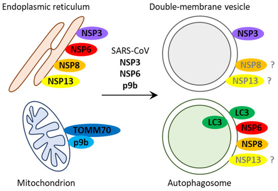 - Cottam, E.M.; Maier, H.J.; Manifava, M.; Vaux, L.C.; Chandra-Schoenfelder, P.; Gerner, W.; Britton, P.; Ktistakis, N.T.; Wileman, T. Coronavirus nsp6 proteins generate autophagosomes from the endoplasmic reticulum via an omegasome intermediate. Autophagy 2011, 7, 1335–1347. [Google Scholar] [CrossRef] [Green Version]