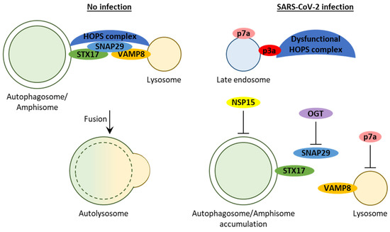 - Miao, G.; Zhao, H.; Li, Y.; Ji, M.; Chen, Y.; Shi, Y.; Bi, Y.; Wang, P.; Zhang, H. ORF3a of the COVID-19 virus SARS-CoV-2 blocks HOPS complex-mediated assembly of the SNARE complex required for autolysosome formation. Dev. Cell 2021, 56, 427–442. [Google Scholar] [CrossRef] [PubMed]
