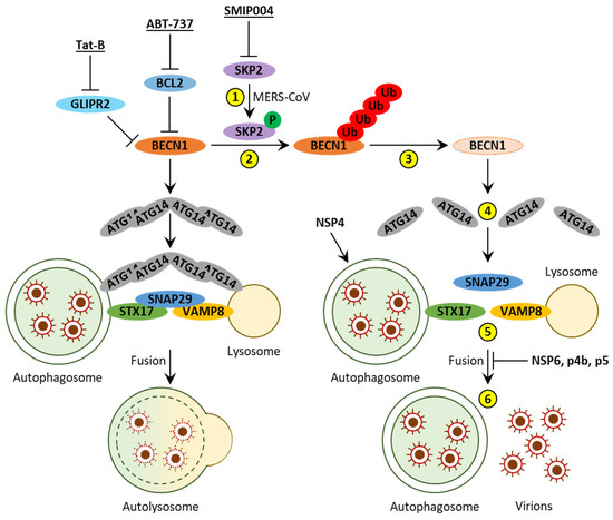 - Gassen, N.C.; Niemeyer, D.; Muth, D.; Corman, V.M.; Martinelli, S.; Gassen, A.; Hafner, K.; Papies, J.; Mosbauer, K.; Zellner, A.; et al. SKP2 attenuates autophagy through Beclin1-ubiquitination and its inhibition reduces MERS-Coronavirus infection. Nat. Commun. 2019, 10, 5770. [Google Scholar] [CrossRef]