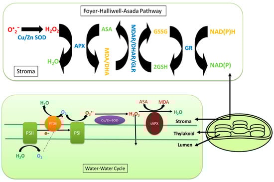 The Foyer–Halliwell–Asada pathway (also known as the ascorbate–glutathione cycle) and the water–water cycle are responsible to quench the superoxide radicles and hydrogen peroxide in the chloroplasts.