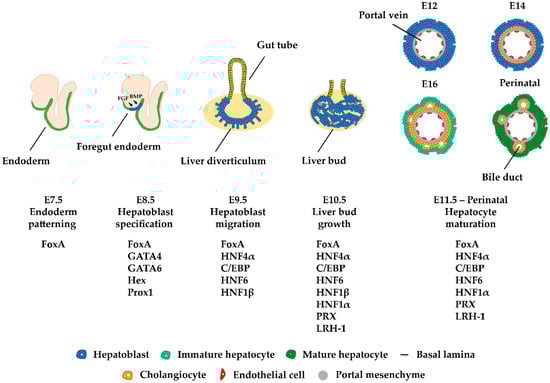 In early embryos, liver organogenesis is initiated from the definitive endoderm. In mice, during gastrulation at embryonic day 6.5 (E6.5), the primitive node is formed on the posterior side of the epiblast. Later on, this knot of cells forms a structure called a primitive streak. Cells migrating from the primitive streak give rise to the mesendoderm, which is the precursor of mesoderm and endoderm. Signaling factors such as Nodal lead these bipotential mesendoderm cells to segregate and generate the definitive endoderm. Through morphogenetic movements, the endoderm forms the primitive gut, which is surrounded by mesoderm. Subsequently, the gut tube is divided along the anterior–posterior axis into the foregut, midgut, and hindgut. At E8.5, cells in the ventral foregut endoderm receive BMP (bone morphogenic protein) signals from the septum transversum mesenchyme, parallel to FGF (fibroblast growth factor) signals from the adjacent developing heart, which facilitates their differentiation into hepatoblasts (Figure 1). Hepatocyte-specific genes such as Albumin, Transthyretin, HNF4α, and α-fetoprotein are first activated at this stage [,].