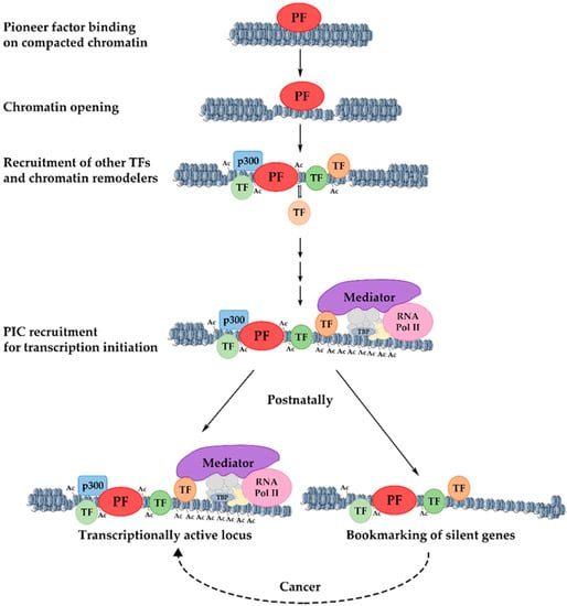 Other studies have demonstrated the role of various pioneer factors (such as FoxA1, GATA4, Oct4, Sox2, Klf4) in establishing a gene expression profile that is permissive to cancer initiation and progression [,,,,,]. Therefore, pioneer and non-pioneer transcription factors may act in concert to confer transcriptional competence to specific silent genes that can be reactivated under certain situations, thus promoting pathological conditions (e.g., cancer).