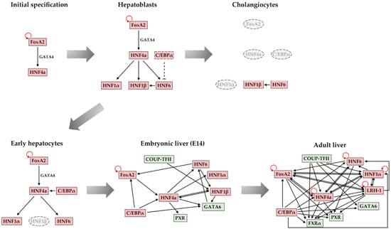 At subsequent stages of hepatocyte maturation, a promoter occupancy analysis of the main hepatic regulators demonstrated multiple cross-regulatory interactions between a core set of six hepatic transcription factors, including HNF1α, HNF1β, HNF4α, HNF6, FoxA2, and LRH-1 []. This regulatory network is established progressively during liver development and expanded by new downstream regulators at specific stages. The hierarchical single-input and double-input motifs dominating at the early stages expand through the activation of additional downstream regulators to multi-input and simple autoregulatory loops. Subsequently, the abovementioned simple motifs integrate into regulatory chains that are dominated by complex multicomponent circuits. The complexity of the network, coming from the increasing number of hepatic regulators recruited to each individual promoter, leads to increased network stability and to the functional redundancy between the different regulatory factors (Figure 3).