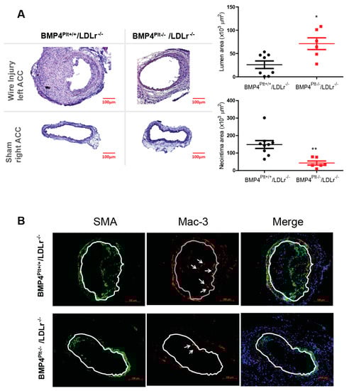 Next, we thought to investigate the role of platelet BMP-4 in a disease model. Various reports have suggested a distinct role of platelets in mediating leukocyte recruitment and neointima formation after arterial injury [,]. In a real world clinical setting, arterial injury often occurs during vascular angioplasty, and these patients usually have atherosclerosis. Therefore, BMP4Ptl+/+ and BMP4Plt−/− mice were bred with LDLr−/− mice to generate an atherosclerosis-prone mouse model. The BMP4Plt−/−/LDLr−/− mice and their littermate control (BMP4Plt+/+/LDLr−/−) at eight weeks of age were fed a Western diet for two weeks, followed by wire injury of the left carotid artery. Two weeks later, the arteries on both sides were excised and analyzed. The size of the neointima lesions was 71.2% larger in the control mice, corresponding to a narrowing of the lumen area by 63.4% compared with the BMP4Plt−/−/LDLr−/− mice (Figure 1A). This finding suggests that the lack of platelet BMP-4 prevented neointimal formation upon injury. Notably, macrophages and smooth muscle cells were significantly decreased in the neointima in the BMP4Plt−/−/LDLr−/− mice compared to control (Figure 1B).