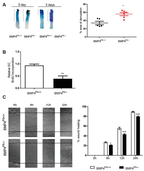 3.3. Lack of Platelet BMP-4 Delays Re-Endothelialization by Inhibiting Endothelial Cell Proliferation and Migration