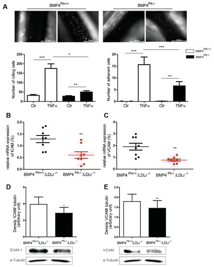 In a next step, we evaluated how wire injury of the carotid arteries affected vascular inflammation. Two weeks after the guide wire injury, the carotid arteries were isolated, and the expression of ICAM-1 and VCAM-1 were analyzed. In comparison to the control mice, the mRNA level of ICAM-1 and VCAM-1 were significantly less in the injured carotid artery of the BMP4Plt−/−/LDLr−/− mice (Figure 3B,C). This was confirmed at protein level by Western blot (Figure 3D,E). Overall, these findings suggest that platelet BMP-4 is involved in mediating vascular inflammation, potentially through regulating the expression of adhesion molecules in endothelial cells and subsequent interaction of leukocytes with the vessel wall.