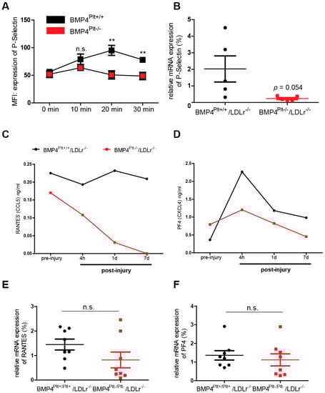 Activated platelets secret various chemokines, which not only activate the endothelium during vascular inflammation, but also indirectly support leukocyte recruitment via formation of platelet-leukocyte aggregates (PLAs). P-selectin is an important mediator in the formation of PLAs. It is secreted by platelets upon their activation and interacts with the P-selectin glycoprotein ligand (PSGL)-1 on leukocytes [,]. To further investigate whether platelet BMP-4 affects the secretion of P-selectin in platelets, the mice were treated with TNFα (10 ng/g body weight) and expression of P-selectin was analyzed using flow cytometry after 10, 20, or 30 min. Interestingly, P-selectin expression increased in a time-dependent manner in the control mice, while its expression level remained unchanged and at a lower level in the BMP4Plt−/− mice (Figure 4A). The expression of the P-selectin mRNA was also diminished in the BMP4Plt−/−/LDLr−/− mice 14 days after carotid wire injury (Figure 4B), although the result barely missed statistical significance (p = 0.054).