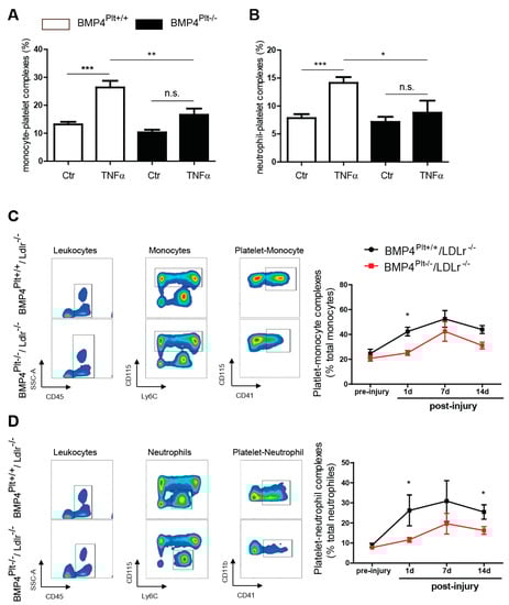 In a next step, we evaluated the formation of PLAs. Stimulation with TNFα significantly increased the formation of monocyte-platelet aggregates in the control mice, which was less pronounced in the BMP4Plt−/− mice (Figure 5A). The same result was seen in platelet-neutrophil aggregate formation (Figure 5B). Similarly, platelet-leukocyte aggregation also increased upon guide wire injury of the carotids (Figure 5C,D). The aggregate formation was time-dependent with a peak at day seven after carotid injury and rapidly decreased towards day fourteen. Aggregate formation was more pronounced in the control mice, than in the BMP4Plt−/−/LDLr−/− mice, with the biggest difference between the control and BMP4Plt−/−/LDLr−/− mice at day one. Together, these findings demonstrate that platelet BMP-4 is involved in the regulation of platelet function and the cross-talk of platelets with other immune cells.