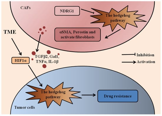 The HH pathway in gastrointestinal cancers and TME. The role of HH signaling in drug resistance of gastrointestinal cancers and CAFs is summarized. Activated HH signaling is found in CAFs with elevated expression of αSMA and periostin. NDRG1 reduces CAF-mediated cell migration and the CAFs’ activation through inhibition of HH signaling. TME-derived HIF1α and CAF-derived TGFβ2, Gal1, TNFα, and IL-1β may activate HH signaling in tumor cells to induce drug resistance. Hedgehog (HH); tumor microenvironment (TME); cancer associated fibroblasts (CAFs); alpha smooth muscle actin (αSMA); N-myc downstream-regulated gene 1 (NDRG1); hypoxia inducible factor 1α (HIF1α); transforming growth factor β2 (TGFβ2); glycan-binding protein galectin-1 (Gal1); tumor necrosis factor α (TNFα); interleukin-1β (IL-1β).